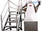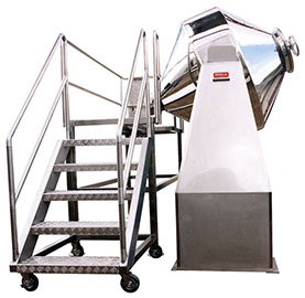 Mezclador bicónico con plataforma de carga, escaleras de acceso, barandas y garruchas para una fácil manipulación. Bastidor en acero inoxidable.
